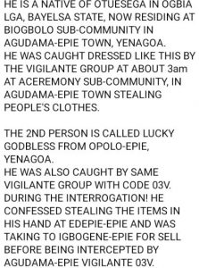 “THE 2ND PERSON IS CALLED LUCKY GODBLESS FROM OPOLO-EPIE, YENAGOA. HE WAS ALSO CAUGHT BY SAME VIGILANTE GROUP WITH CODE 03V.