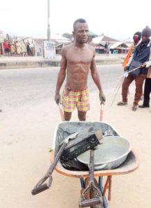“HE WAS CAUGHT DRESSED LIKE THIS BY THE VIGILANTE GROUP AT ABOUT 3am AT ACEREMONY SUB-COMMUNITY, IN AGUDAMA-EPIE TOWN STEALING PEOPLE’S CLOTHES.