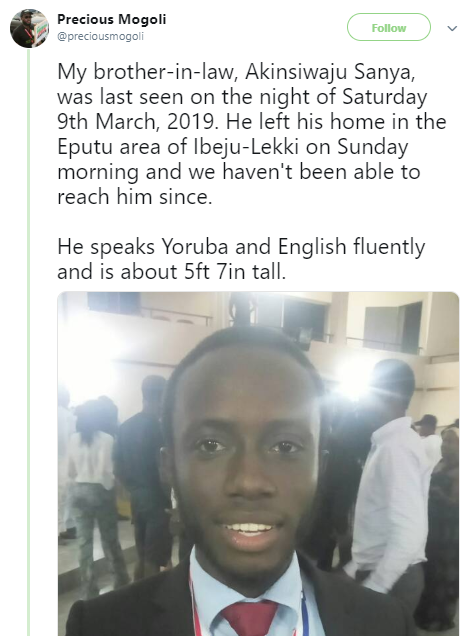 ”My brother-in-law, Akinsiwaju Sanya, was last seen on the night of Saturday 9th March, 2019. He left his home in the Eputu area of Ibeju-Lekki on Sunday morning and we haven’t been able to reach him since. He speaks Yoruba and English fluently and is about 5ft 7in tall.