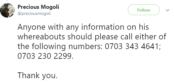 Anyone with any information on his whereabouts should please call either of the following numbers: 0703 343 4641; 0703 230 2299. Thank you.