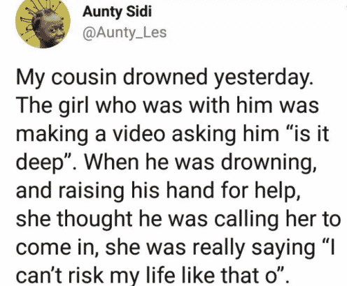 My cousin drowned yesterday. The girl who was with him was making a video asking him “is it deep”. When he was drowning, and raising his hand for help, she thought he was calling her to come in, she was really saying “I can’t risk my life like that o”.