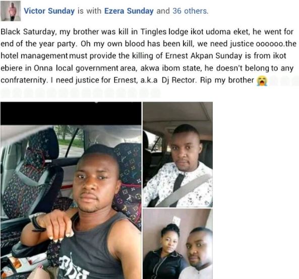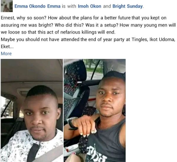 According to reports, Ernest was at Tingles lodge, Ikot Udoma in Eket for an End of Year party alongside his friends on Friday night, December 17.