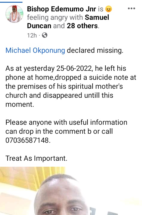 It was gathered that Okponung was last seen in the early hours of Saturday, June 25, after dropping a suicide note at the premises of his spiritual mother’s church.