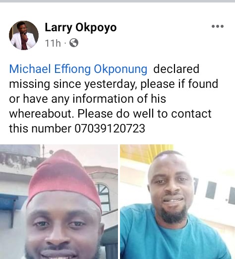 He has been declared missing by his family in Uyo, Akwa Ibom State.