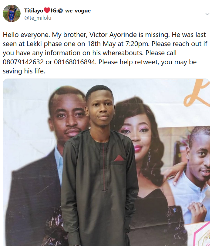 “Hello everyone. My brother, Victor Ayorinde is missing. He was last seen at Lekki phase one on 18th May at 7:20pm. Please reach out if you have any information on his whereabouts. Please call 08079142632 or 08168016894. Please help retweet, you may be saving his life”
