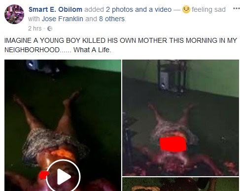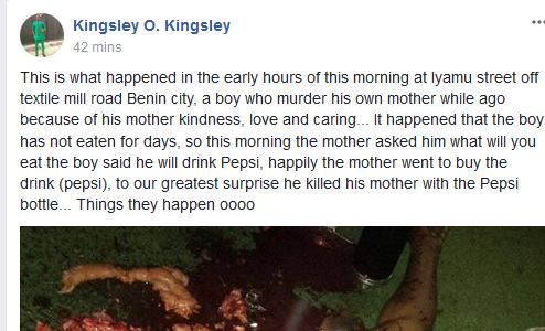 Police operatives have arrested a young man for killing his own mother in Benin city, Edo state. According to multiple online reports, the young man killed his mother as he smashed her head open with a weapon for reasons best known to him.The incident which happened in the early hours of this morning at Iyamu street, off textile mill road in Benin caused panic in the area.