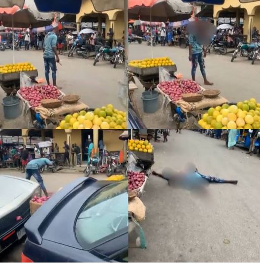 On-lookers were left in shock as an unidentified man stabbed himself and attempted to slit his throat with a knife along Market Road in Sapele, Delta state today, November, 2.