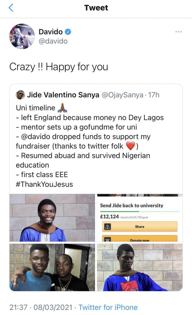 His tweet read: “University timeline, I left England because money no they Lagos, mentor sets up a gofundme for me.“Davido dropped funds to support my fundraiser (thanks to twitter folk), resumed ABUAD and survived Nigerian education with first class EEE.“Thank you so much Davido.”