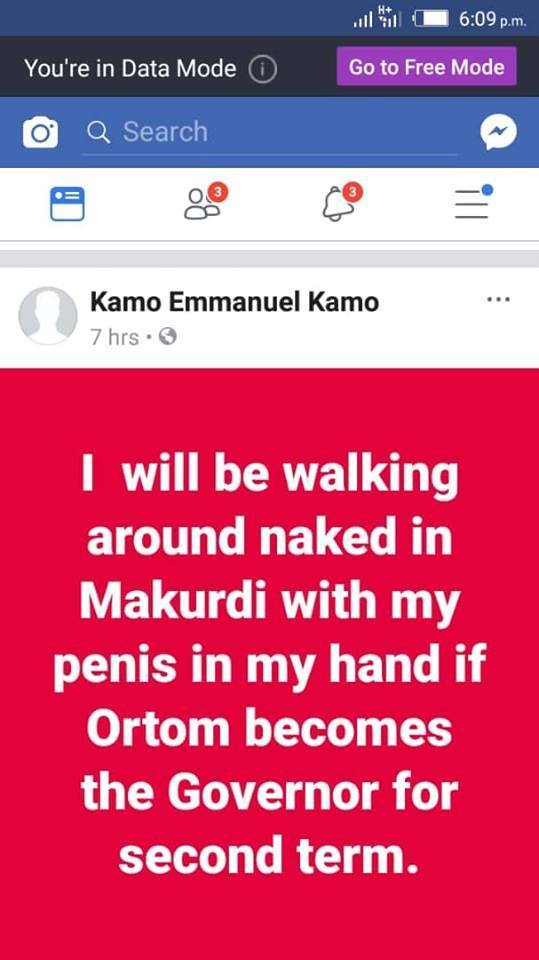 “I will be waking Unclad around Benue with my joystick in my hand if Ortom becomes Governor for second term,” he also promised in a post on his Facebook wall.