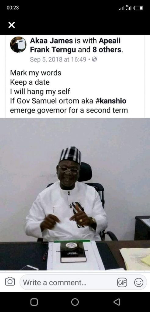 “Mark my words. Keep a date. I will hang myself if God Samuel Ortom aka Kansio emerge governor for a second time (sic),” he had written on his Facebook wall.