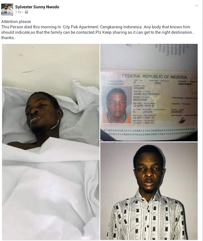 The sad news was shared by a Facebook user, Sylvester Nwodo. It was gathered that the young man’s body was discovered on Monday morning, February 17. “This Person died this morning In City Pak Apartment Cengkareng Indonesia .Any body that knows him should indicate, so that the family can be contacted. Plz Keep sharing so it can get to the right destination.. thanks.”