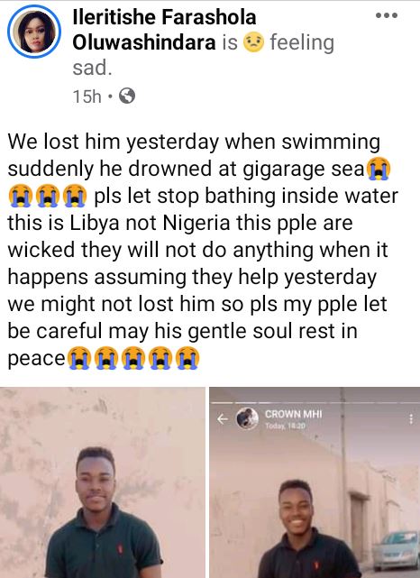 “We lost him yesterday when swimming. Suddenly he drowned at gigarage sea. Pls let’s stop bathing inside water. This is Libya not Nigeria. This people are wicked. They will not do anything when it happens.