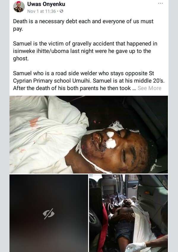 “Death is a necessary debt each and everyone of us must pay.Samuel is the victim of gravelly accident that happened in isinweke ihitte/uboma last night were he gave up to the ghost.Samuel who is a road side welder who stays opposite St Cyprian Primary school Umuihi. Samuel is at his middle 20’s. After the death of his both parents he then took the responsibility of his late parents by taking good care of his only sibling.But death couldn’t allow him to reap all he laboured for. In all we must give thanks to Almighty God for past years of his life in this planet earth.May his soul and the souls of the saints and all the faithful departed through the mercy of God rest in peace Amen.