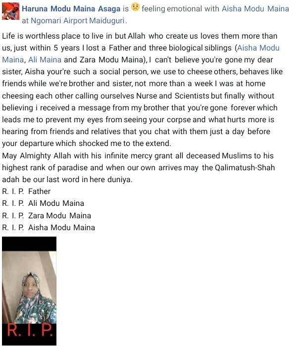 Their elder brother, Haruna Modu Maina Asaga took to Facebook to mourn the death of his sibling. He revealed that he has buried four members of his family in five years including her father and three siblings.