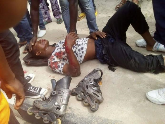 According to an eye witness, this skater who wasn’t wearing any protective gear, was holding onto a speeding commercial bus (danfo) coming from Ajah and heading to Lekki. He lost his control when he couldn’t keep up with the way the driver was speeding, stumbled and slammed onto the major road, breaking his right leg in the process.