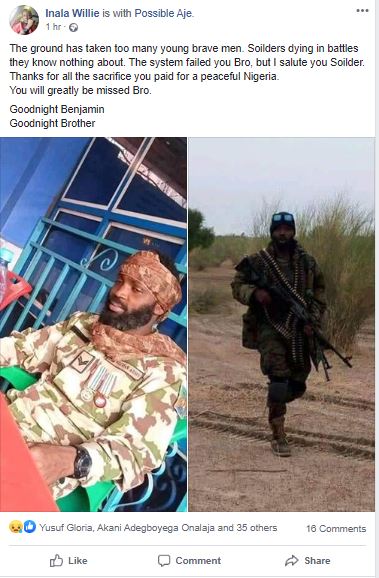 “The ground has taken too many young brave men. Soilders dying in battles they know nothing about. The system failed you Bro, but I salute you Soilder. Thanks for all the sacrifice you paid for a peaceful Nigeria.