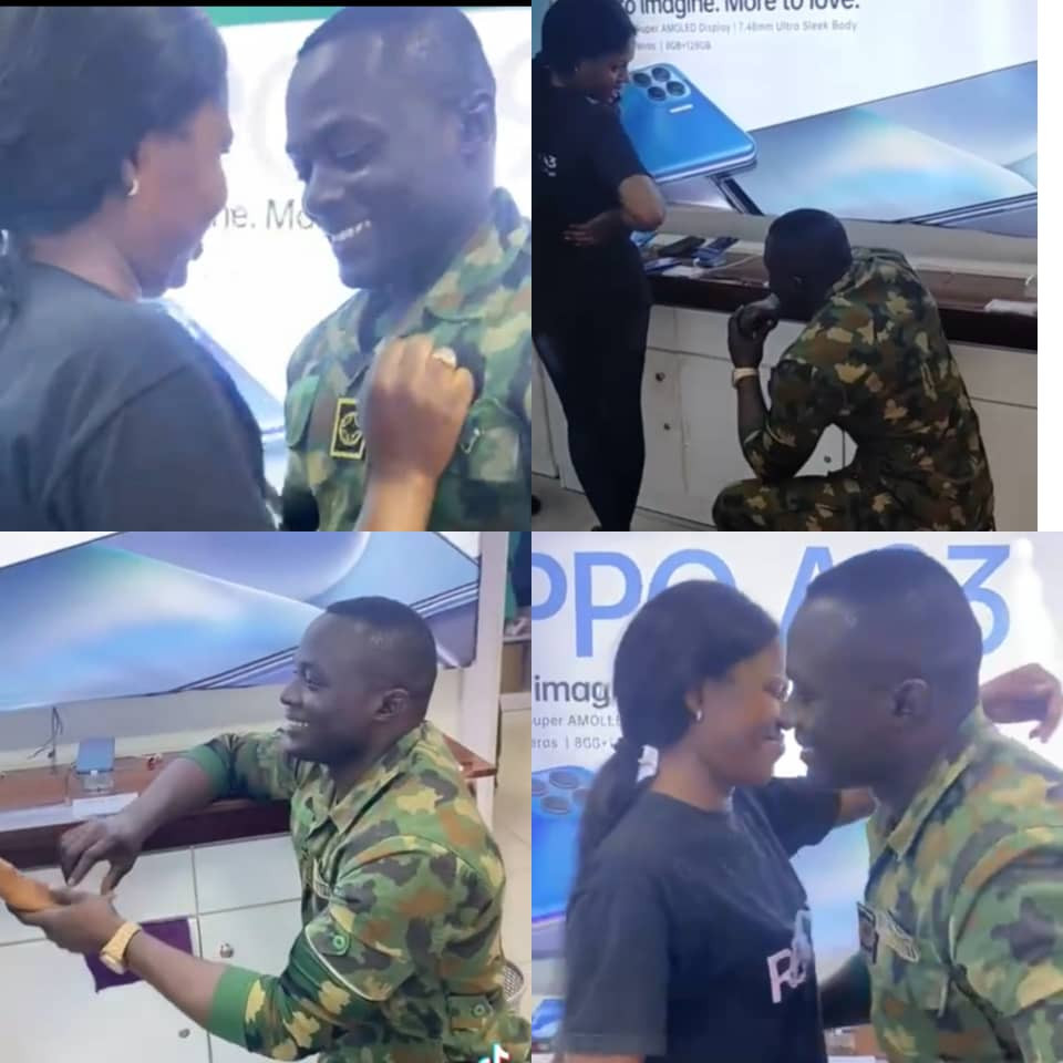 The moment a Nigerian soldier proposed to his girlfriend at her work place has left many people touched.