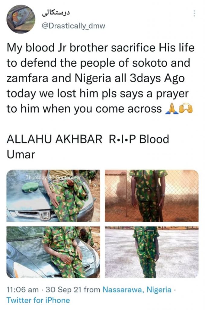 “My blood Jr brother sacrifice His life to defend the people of sokoto and zamfara and Nigeria all 3days Ago today we lost him pls says a prayer to him when you come across
