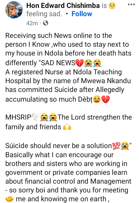 “On a sad note we have lost a member of staff Ms.Nkandu Mwewa RN. Condolences to her family and staff at NTH. M.H.S.R.P,” the statement read.
