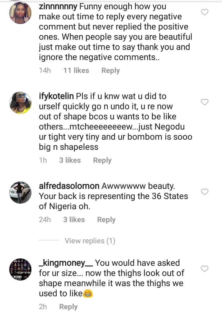 Recall that Dabota reportedly spent millions of naira on cosmetic surgery to get her curvy backside.