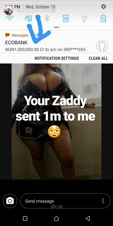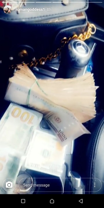 Instagram Controversial endowed Model Roman Goddess who is use to show off her gigantic front view is at it again, she show off credit alert of about 1.5million naira and in her car some wads of dollars alos available their.