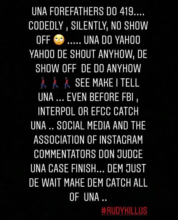 He wrote: “See make I tell una… Even before FBI, Interpol, or EFCC catch una… Social media and the association of Instagram commenters don judge una case finish.”