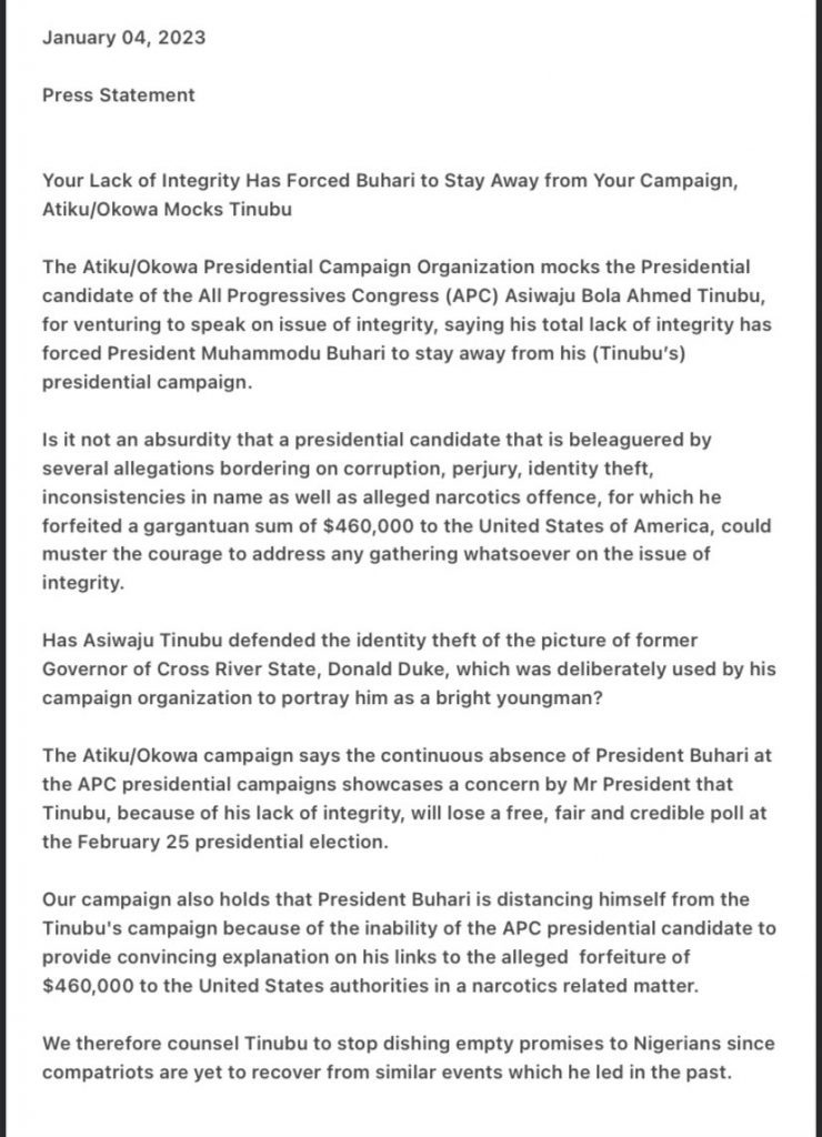 The Atiku/Okowa campaign says the continuous absence of President Buhari at the APC presidential campaigns showcases a concern by Mr President that Tinubu, because of his lack of integrity, will lose a free, fair and credible poll at the February 25 presidential election.