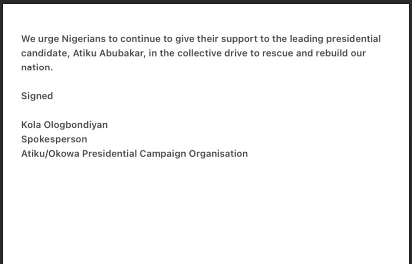 We urge Nigerians to continue to give their support to the leading presidential candidate, Atiku Abubakar, in the collective drive to rescue and rebuild our nation.
