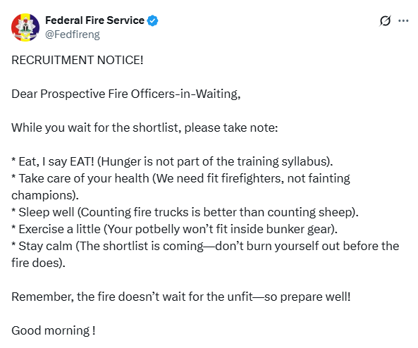 “RECRUITMENT NOTICE! Dear Prospective Fire Officers-in-Waiting, While you wait for the shortlist, please take note: * Eat, I say EAT! (Hunger is not part of the training syllabus),” the notice reads.