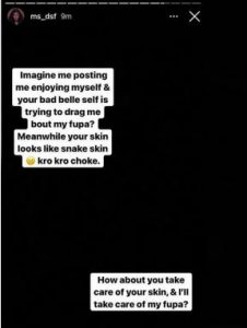 Nollywood actress and disc jockey, Dorcas Fapson has dragged a troll who slammed her over her belly fat.