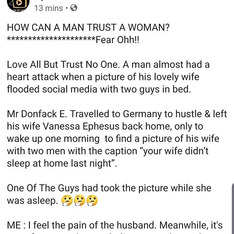 Love All But Trust No One. A man almost had a heart attack when a picture of his lovely wife flooded social media with two guys in bed.