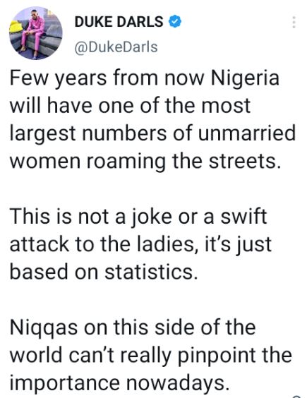 “Few years from now Nigeria will have one of the most largest numbers of unmarried women roaming the streets. This is not a joke or a swift attack to the ladies, it’s just based on statistics. Niqqas on this side of the world can’t really pinpoint the importance nowadays,” he tweeted on Sunday, March 5, 2023.