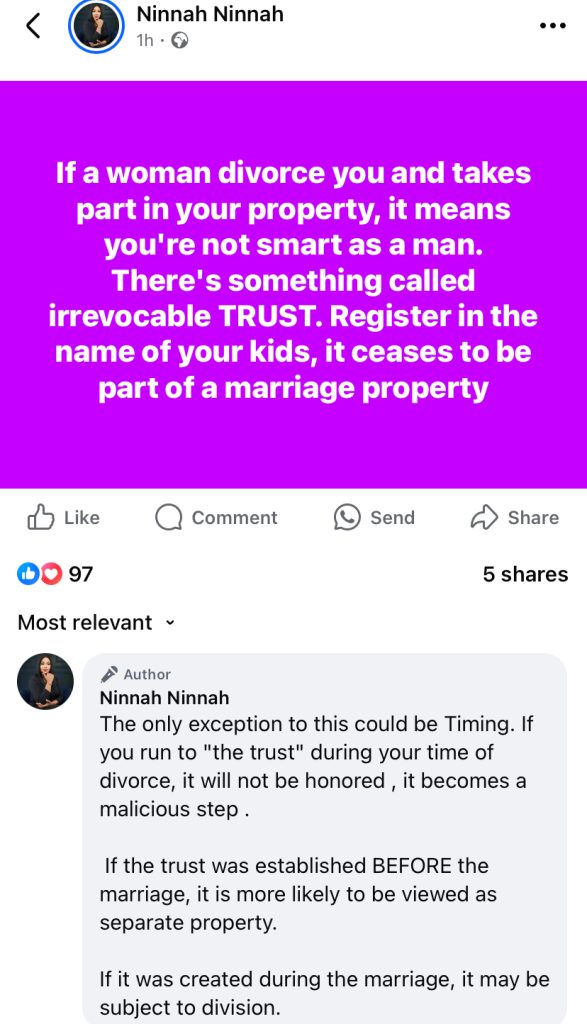 “If a woman divorces you and takes part of your property, it means you’re not smart as a man,”she wrote. “There’s something called irrevocable TRUST. Register in the name of your kids, it ceases to be part of a marriage property.”