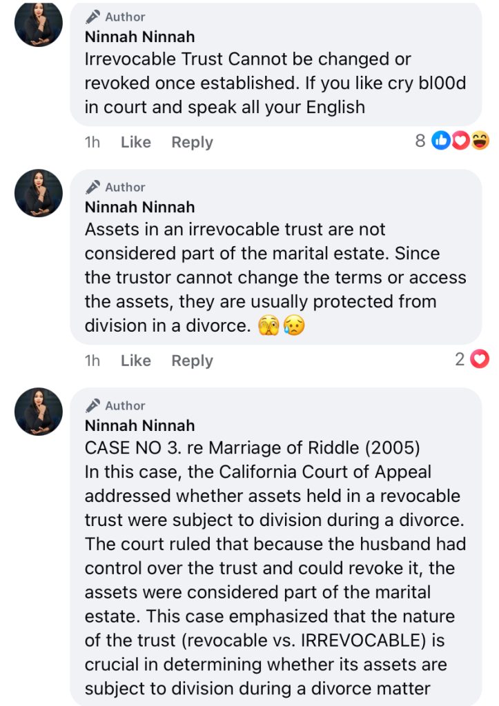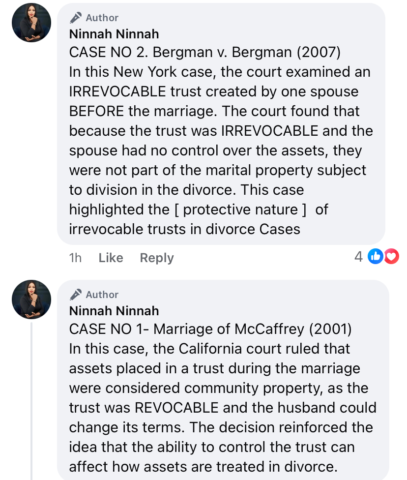 “The only exception to this could be Timing. If you run to “the trust” during your time of divorce, it will not be honored , it becomes a malicious step,” she added. “If the trust was established BEFORE the marriage, it is more likely to be viewed as separate property. If it was created during the marriage, it may be subject to division.”