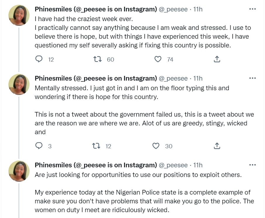 Mentally stressed. I just got in and I am on the floor typing this and wondering if there is hope for this country. This is not a tweet about the government failed us, this is a tweet about we are the reason we are where we are. Alot of us are greedy, stingy, wicked and are just looking for opportunities to use our positions to exploit others. My experience today at the Nigerian Police state is a complete example of make sure you don’t have problems that will make you go to the police. The women on duty I meet are ridiculously wicked.