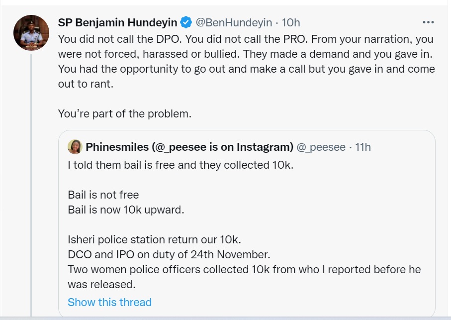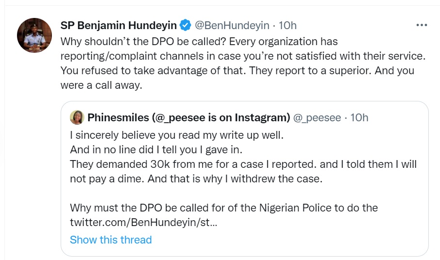 I sincerely believe you read my write up well. And in no line did I tell you I gave in. They demanded 30k from me for a case I reported. and I told them I will not pay a dime. And that is why I withdrew the case. Why must the DPO be called for of the Nigerian Police to do the right thing. I withdrew the case and your men went behind my back to collect 10k from the guy I reported before he was released. He was told if he doesn’t pay they won’t release him.