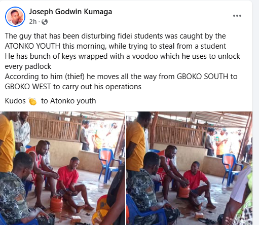 “The guy that has been disturbing Fidei students was caught by the ATONKO YOUTH this morning, while trying to steal from a student. He has abunch of keys wrapped with a voodoo which he uses to unlock every padlock. According to him (thief) he moves all the way from GBOKO SOUTH to GBOKO WEST to carry out his operations.”