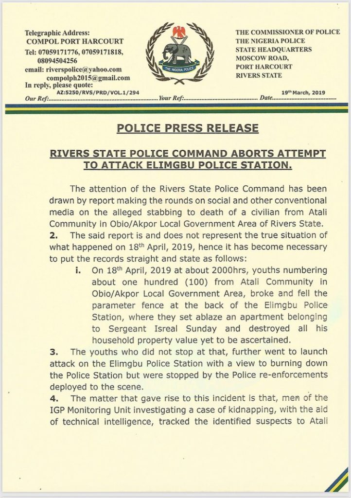HAPPENING NOW Police officer by the name Chinedu stabbed & murdered an innocent man named Nyebuchi at Atali/Elimgbu, Obio/Akpor LGA. Rivers State. When the youths of the area went on protest at the station, @PoliceNG shot sporadically at unarmed civilians.
