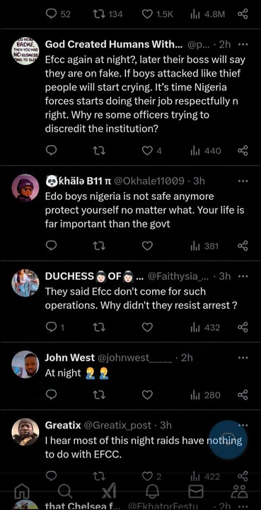 The incident has sparked outrage on social media, particularly on Instagram and X (formerly Twitter), where users have questioned why the EFCC would conduct such an operation at night and in this manner. Some have even compared it to an armed robbery.