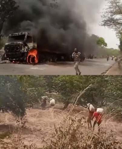 A video of some youths stealing bags of cement from a burning truck has been shared online. The truck was traveling along Benue Highway when it suddenly caught fire, forcing the driver to abandon the vehicle. The trending video shows residents of the area trooping out to steal bags of cement as the fire raged on.