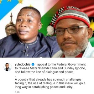 Popular Nollywood actor and aspiring presidential candidate, Yul Edochie, has appealed to the Federal government to release IPOB leader, Mazi Nnamdi Kanu and Yoruba Nation agitator, Sunday Adeyemo (a.k.a. Sunday Igboho), and follow dialogue and peace.
