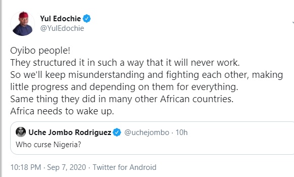 The actor who said this in a tweet which served as a response to Actress Uche Jombo’s question of “who cursed Nigeria”, averred that the country was structured to never work. Yul stated that the aim of such structuralization is for Nigerians to keep misunderstanding and fighting each other, making little progress and depending on their colonizers for everything.