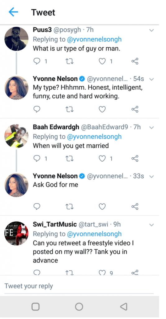 In a Question and Answer session with some fans on Twitter, the Ghanaian actress revealed that she lost her virginity on February 14 (Valentine’s Day) 2017. Yvonne also disclosed that her type of man must be hardworking, funny, cute, honest and intelligent.