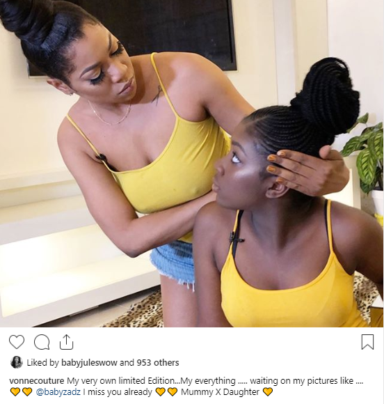 “My very own limited Edition…My everything ….. waiting on my pictures like …. @babyzadz I miss you already. Mummy X Daughter,” the CEO of Yvonne couture wrote as she shared the photo.