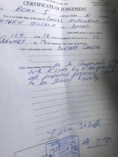 The Court ordered that the man pays her a total of K12, 000.00 in monthly installments (K1, 000.00X12months) as compensation and alimony.