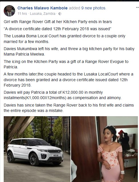 A woman who went viral online last year, when she got a range rover from her man on her lavish kitchen party – has been divorced with the man allegedly returning to his first wife. According to reports, the lady identified as Patricia Mwelwa was the man’s side chic and baby mama before she was upgraded to his wife in a lavish and highly publicized wedding last year.