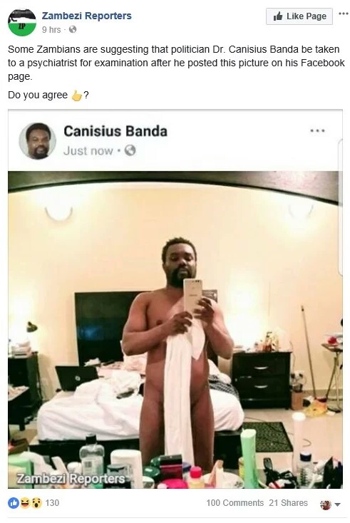 A Zambian politician and former opposition UPND Vice President, Dr. Canisius Banda has left friends and fans in shock after a nude photo of himself was posted on his Facebook page. A lot of Zambians were shocked and suspected he was either trying to send the pics to a lady and then mistakenly posts to Facebook, or his account must have been hacked.