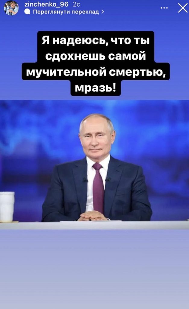 Zinchenko, on his Instagram story, posted a photo of Putin with the caption: ‘I hope you die the most painful suffering death, creature.’